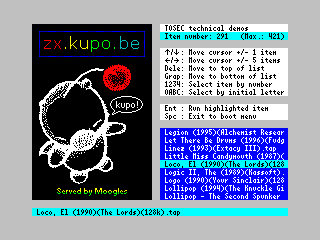 zx.kupo.be, Spectranet host - Not a website, Kupo! Introduction: This is the hostname of zx.kupo.be, a TNFS host for the Sinclair Spectrum equipped with Spectranet. The Spectranet is an Ethernet (Cat5) interface for the ZX-Spectrum range of computers, if you're seeing this page you are not connecting via such a device and are instead attempting to view the TNFS as a web page, this will not work. [Update: 31 Dec 2022]: Thanks to an old friend of Adam's (JeDa), who graciously helped me out with the tnfsd config the system is now back online and accessable. Although neither of us have a spectranet adaptor, it has been tested with phptnfs, which seems to indicate that it is all ok. feel free to mail me if there are any issues. [Update: 30 Dec 2022]: Since Adam passed away in 2020, this service has been offline dispite some heroic efforts to host a backup elseware. Being his brother, and also having an intrest in the retro scene and also because of several requests to do so, I have invested in a basic VPS and reinstated the service as it was (or as close as possible). Please bear in mind that, unlike Adam, I am a full time dad and as such will not be able to dedicate all of my time to this endevour. That being said, I miss my brother very much and I'm proud to be the one looking after his legacy. Requests for changes can be set to tim at kupo dot be or mog at kupo dot be as usual. NOTE: as of this date, ONLY the web side is currently running. I am familier with linux systems but unfamilier with tnfsd, which this service relies on. I am worrking to restore this ASAP. Update to follow. Thanks for reading and enjoy. Tim Colley (Shiver) [Update: 16 Dec 2019]: As there seems to be some interest in preserving this TNFS site for archival purposes and as a backup in case of disaster, you can now download a tarball of the entire tnfs here however the copyright status of some of the content is rather ambiguous so keep that in mind if using it on any public facing server. Here's what you'd see if you were connected via spectranet: